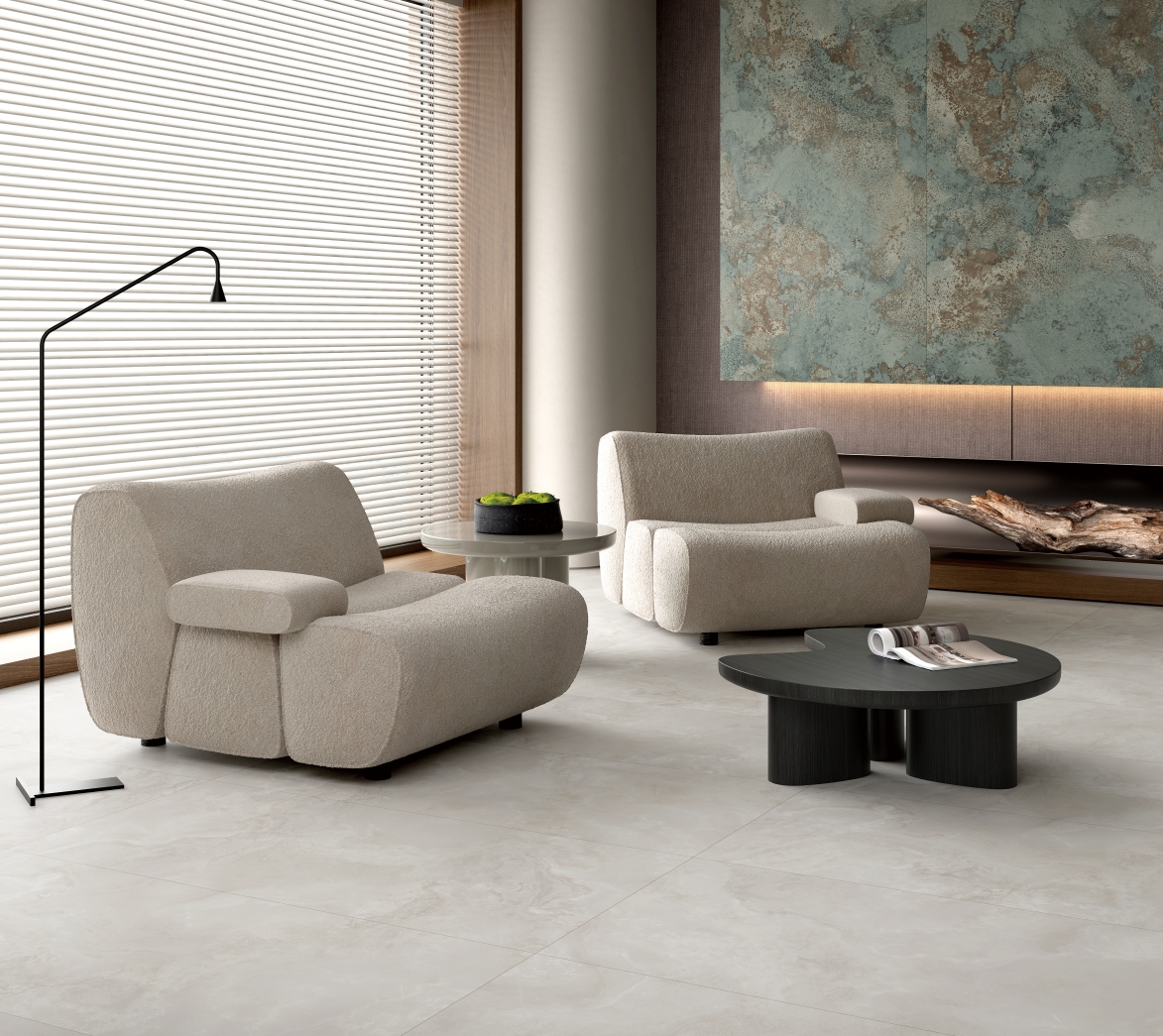 自然通透細(xì)膩,灰色線條、肆意飄散的紋理,深淺變化不一縱情延伸, 在空間里獨(dú)自綻放光彩,營(yíng)造了獨(dú)特隨性的空間氛圍。