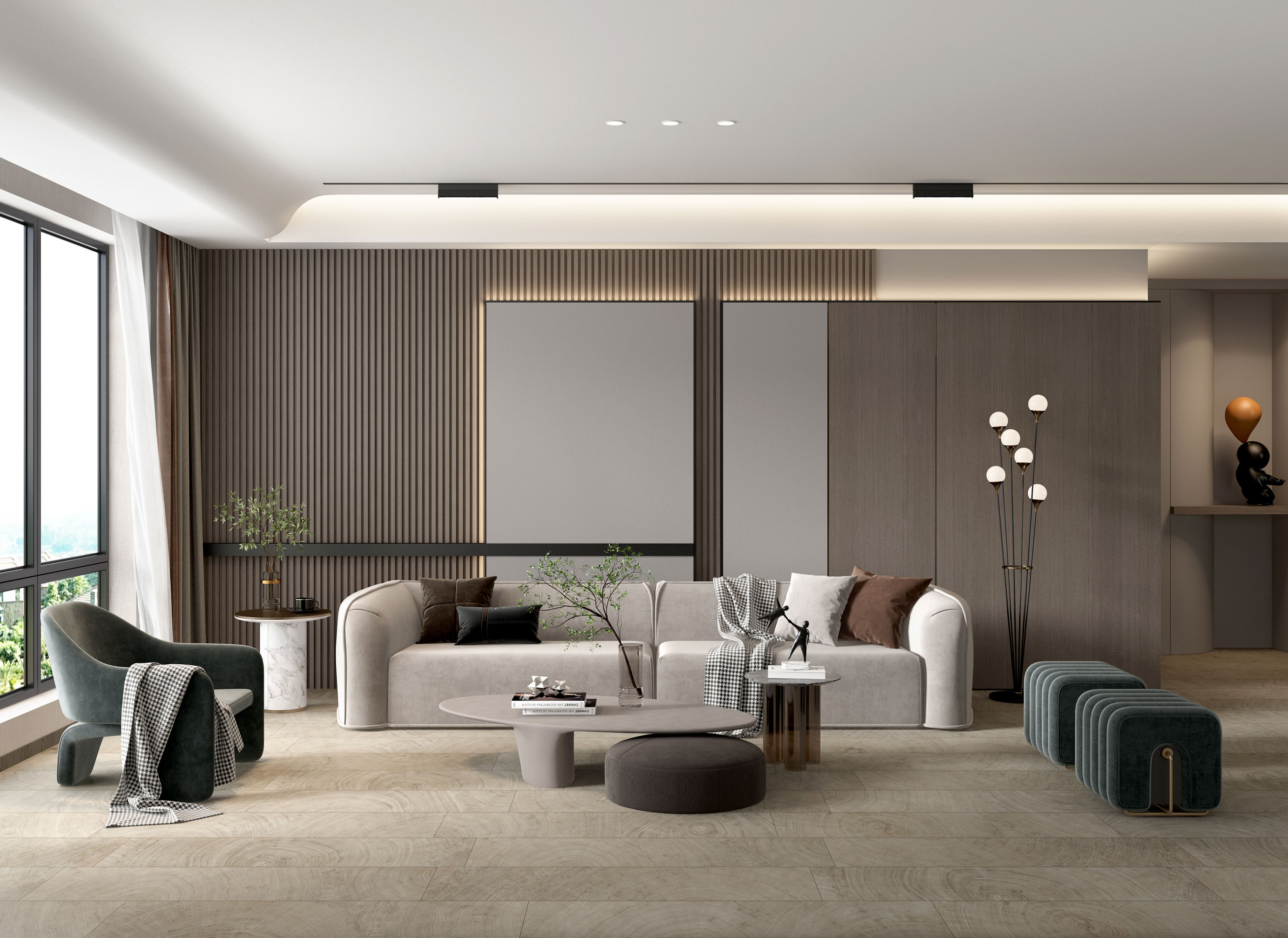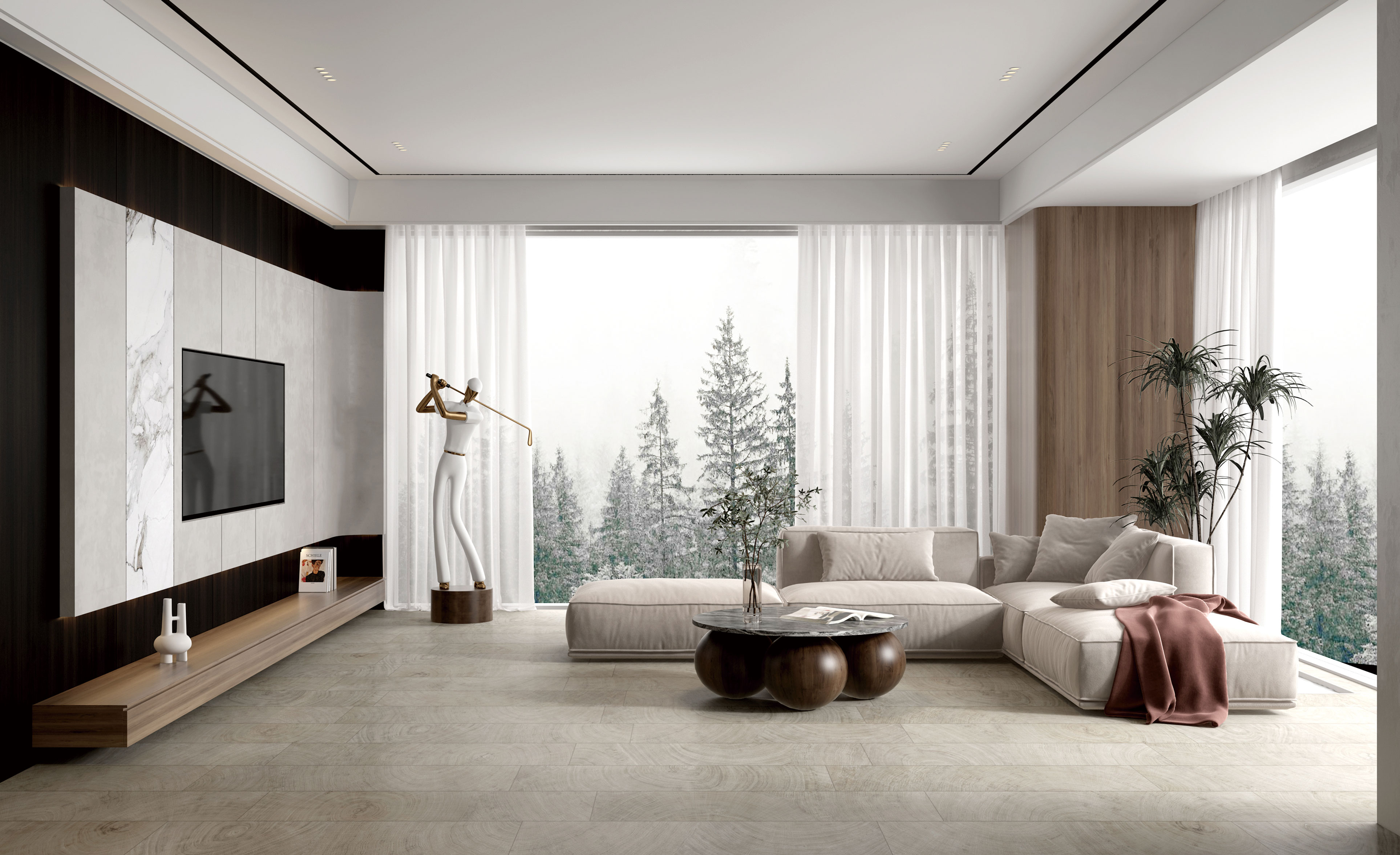 靈感源于處于不同經(jīng)緯度生長的樹木,進行橫向切割所呈現(xiàn)的原木色年輪紋,并將不同種類的樹木進行二次創(chuàng)作,打造出獨一無二的木紋產(chǎn)品,營造雅致的茶室空間。